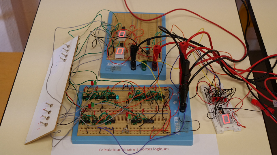binaire à 4 chiffres + retenue de 16 (led bleue) avec des portes logiques. Affichage en base 10.