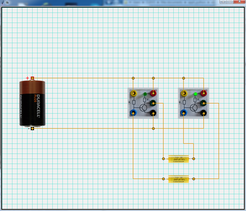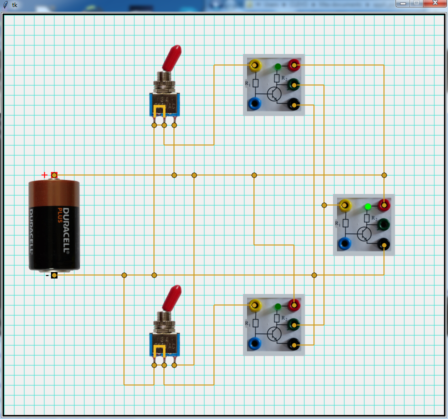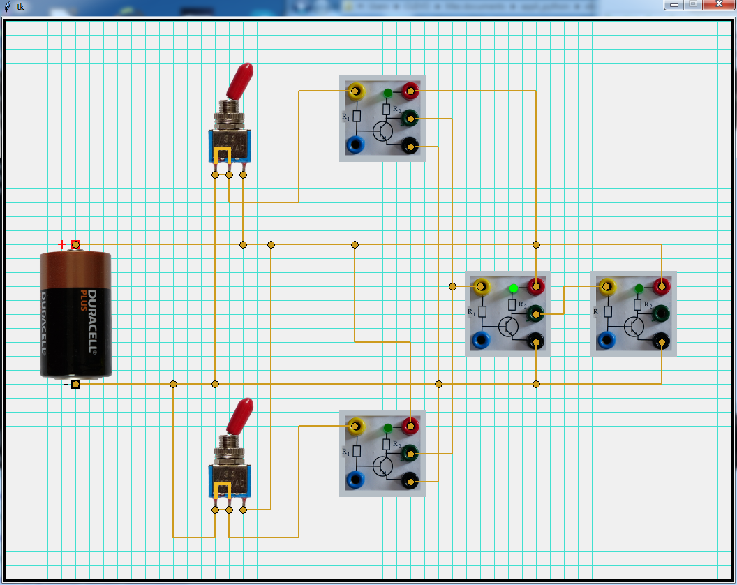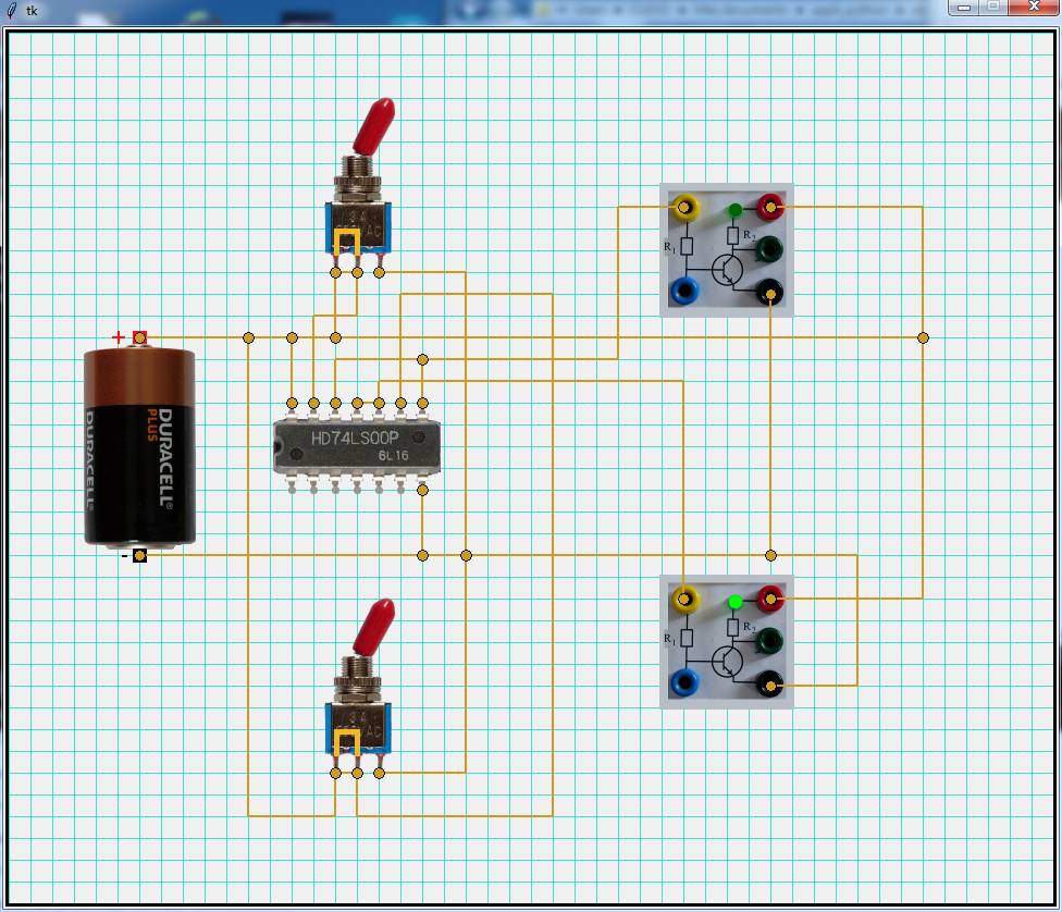 Translab est une procédure en langage Python qui permet de tracer le schéma d'un circuit électronique et de simuler son fonctionnement. L'utilisateur interagit en cliquant sur des commutateurs. Le circuit réagit en allumant des leds et des afficheurs numériques. Le paragraphe qui suit montre des copies d'écran de 18 exemples de circuits tracés en quelques secondes ou quelques minutes et simulés dans Translab. On trouvera ici le lien de téléchargement de la procédure Python translab_18_06.py, avec les 18 exemples de mises en données, exécutables directement. On trouvera ici la documentation pdf pour utiliser Translab : - ouvrir une mise en données existante et l'exécuter, - modifier ou créer une mise en données et l'enregistrer. Le module Python Translab propose actuellement 7 types de composants électroniques sous forme d'objets Python. Il est possible pour l'utilisateur de créer ses propres objets Python pour d'autres types de composants électroniques. Les circuits modélisés et présentés ci-dessous font l'objet de réalisations avec des "vrais" composants, dont on peut voir les photos ici ou là, accompagnées de liens explicatifs.