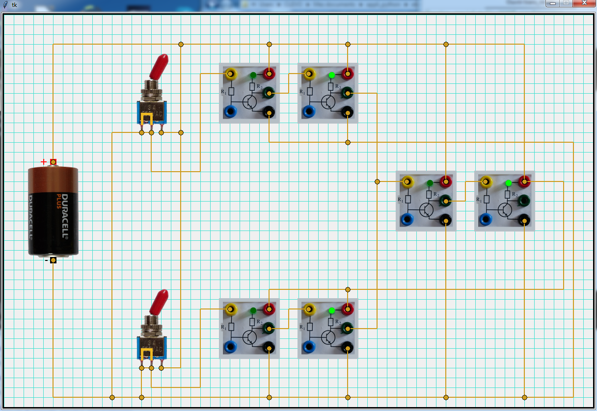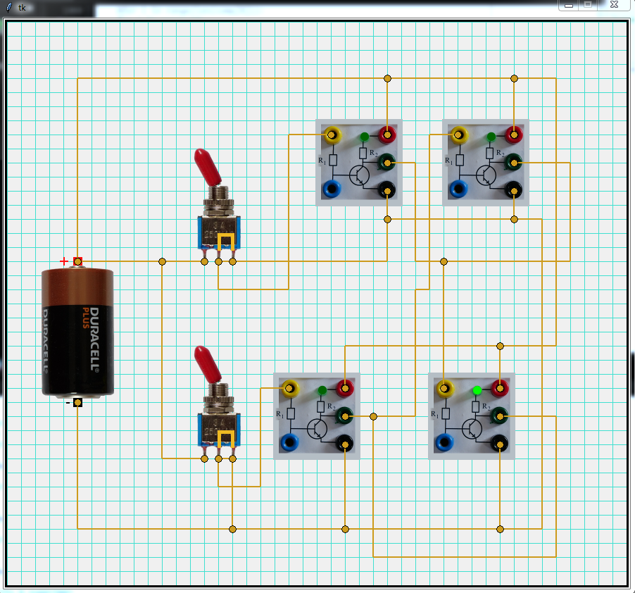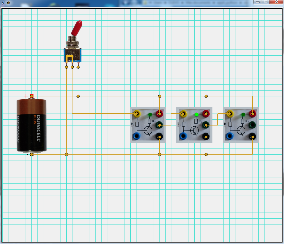 En reliant la base d'un transistor (borne jaune) au collecteur (borne verte) de celui qui précède, on obtient une fonction logique non. Dans ce genre de circuit, il n'existe que 2 états pour un point du circuit : état 1 si la tension vaut 5 volts, état 0 si la tension vaut 0 volt. La fonction non produit 1 à sa sortie (borne verte) si son entrée (borne jaune) vaut 0, et elle produit 0 à sa sortie si son entrée vaut 1. En enchaînant plusieurs transistors de cette façon, on obtient sur les collecteurs une succession d'états 1 et d'états 0. L'état du premier transistor est fixé par le commutateur.