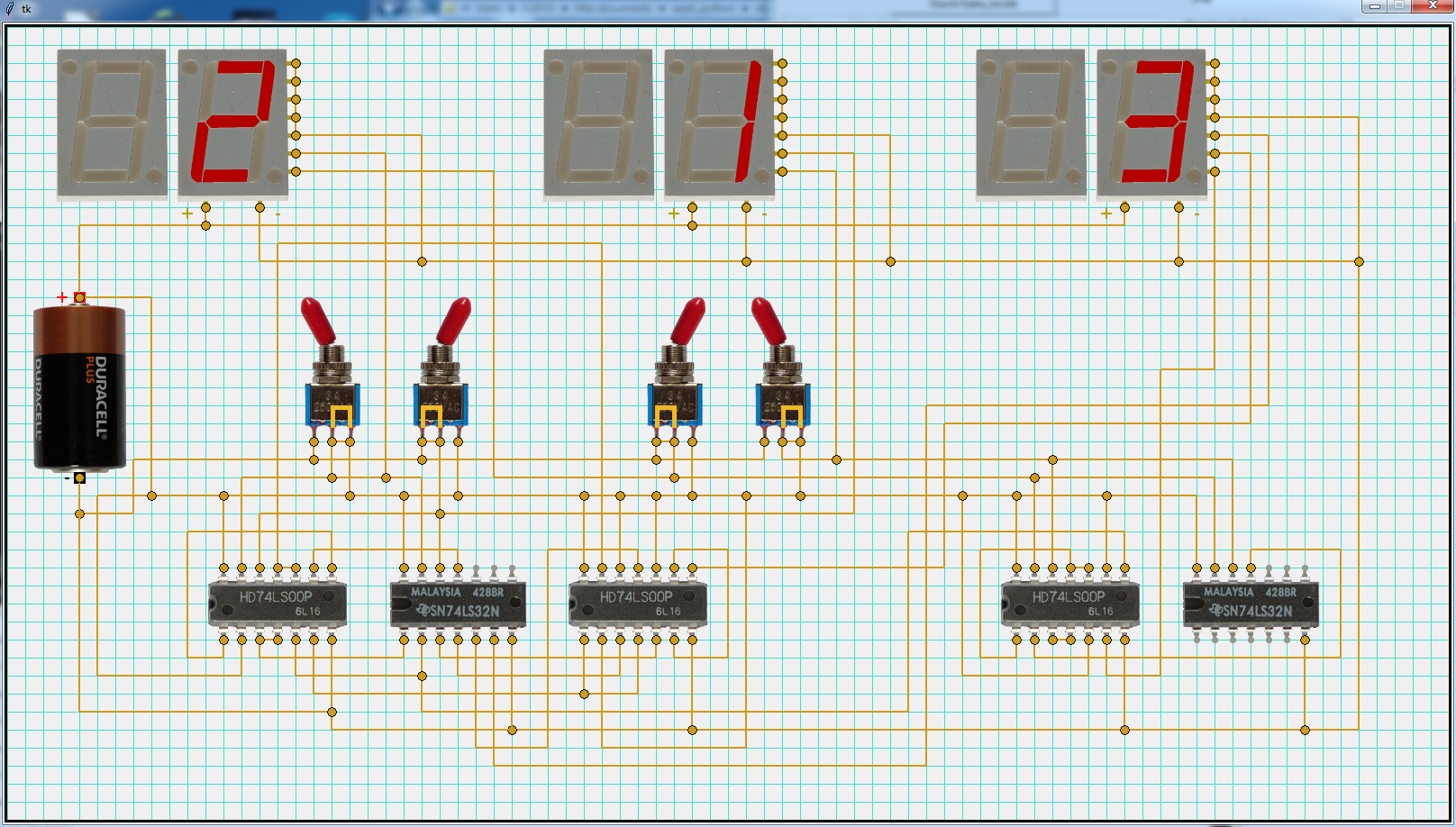 Les 2 afficheurs de gauche indiquent les 2 nombres à additionner et l'afficheur de droite indique le résultat de l'addition. Avec 1 chiffre binaire pour les données, les deux nombres à additionner ne peuvent être que 0 ou 1, ce qui donne un résultat qui ne peut être que 0, 1 ou 2. Ce calcul est effectué avec les 4 portes "non et" d'un circuit intégré 74LS00 et une porte "ou" d'un circuit intégré 74LS32. Voir ce lien pour plus d'explications sur le fonctionnement de ce demi-additionneur.