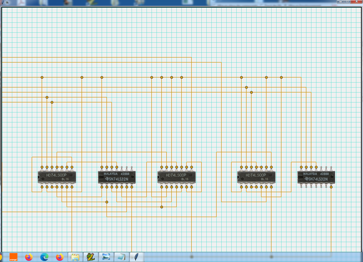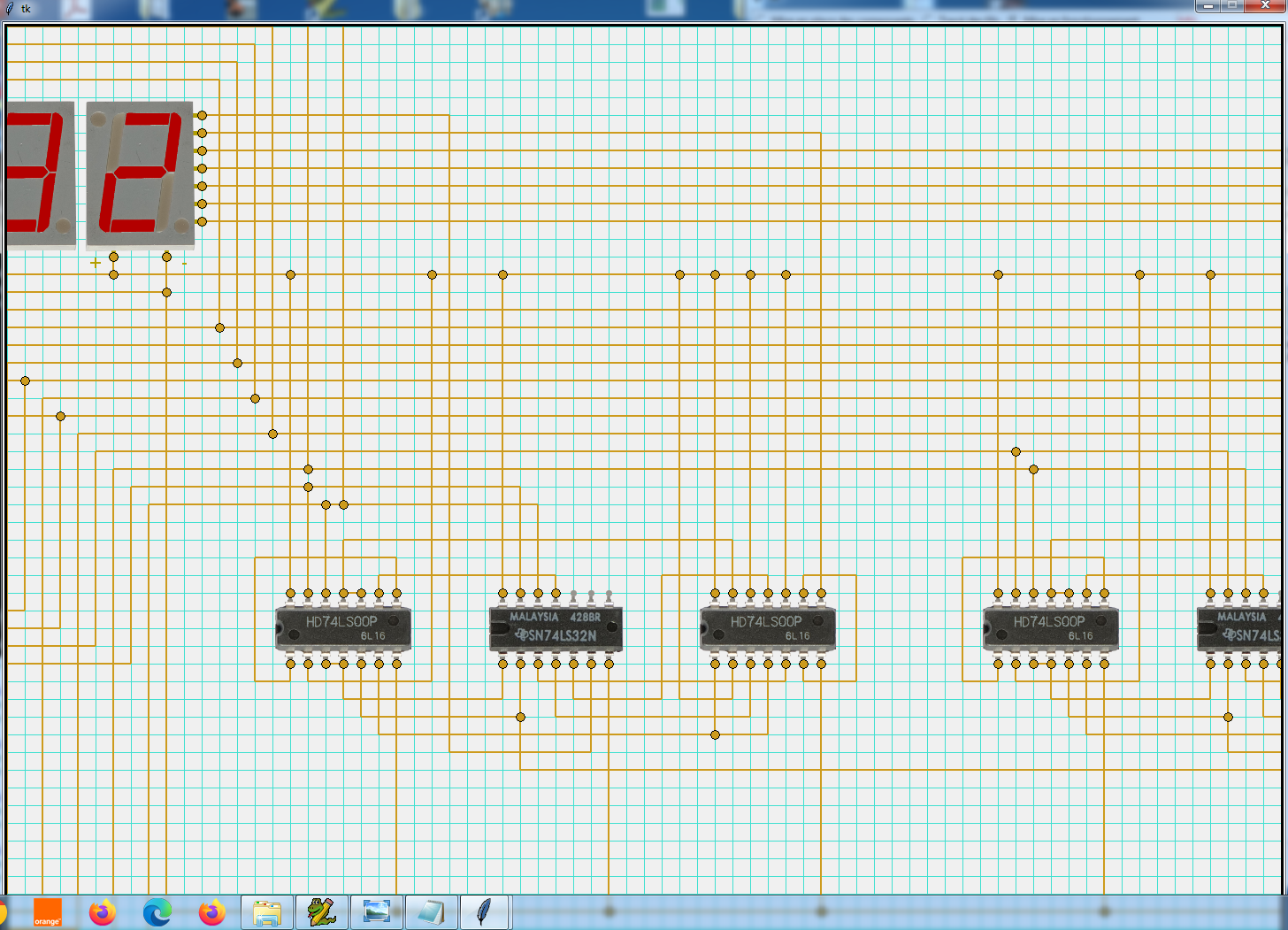 La bonne nouvelle est qu'il n'est pas plus compliqué d'additionner les 2 chiffres des quatraines et de l'éventuelle retenue venant des deuzaines que d'additionner les deuzaines avec l'éventuelle retenue venant des unités comme dans l'exemple précédent. Le même circuit est donc simplement dupliqué pour les quatraines, les huitaines, les seizaines et les trente-deuzaines. Avec une complexité à peine 3 fois et demi plus grande que le circuit à 2 chiffres binaires qui précède, on peut maintenant additionner 2 nombres compris entre 0 et 32 + 16 + 8 + 4 + 2 + 1 = 63, avec la limite d'affichage sur le résultat qui doit être inférieur à 99. La 1ère capture d'écran montre comment régler les commutateurs pour additionner 59 = 32 + 16 + 8 + 2 + 1 et 23 = 16 + 4 + 2 + 1, qui donnent 82. La 2ème capture d'écran montre les circuits d'addition des trente-deuzaines et une partie de ceux des seizaines (identiques). La 3ème capture d'écran montre l'extrémité droite du circuit avec le demi-additionneur des unités (sans retenue venant de sa droite), ainsi que l'additioneur des deuzaines. Il est à noter que le circuit complet de cet exemple comprend 1 générateur 5 volts, 3 afficheurs, 12 commutateurs, 17 circuits intégrés et 217 fils de connexion. Le temps mis par l'ordinateur qui fait tourner la procédure Python Translab est de plusieurs secondes lorsqu'on manoeuvre un commutateur. Il ne faut donc pas s'étonner d'une apparente absence de réponse lorsqu'on clique sur un commutateur. La procédure Translab passe en revue plusieurs fois toutes les connexions possibles entre toutes les "pattes" des composants dessinés. De ce point de vue la procédure pourrait faire l'objet d'optimisations du temps calcul, mais ce serait au dépend d'une relecture plus difficile du programme Python Translab qui doit conserver un caractère pédagogique. Un élève ou un enseignant doit pouvoir intervenir sur ce programme, par exemple pour ajouter des éléments à la liste des 7 types de composants actuellement programmés.